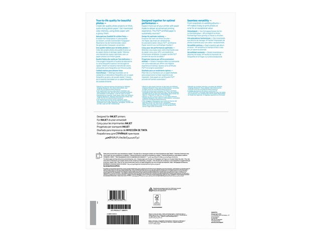 Imprimez de magnifiques photos que vous aimerez regarder et partager. Des photos réalistes présentent des couleurs riches et vives ainsi qu'un fini impressionnant sur ce papier certifié FSC . Vos tirages résistent à la décoloration et ont une finition brillante pour vous garantir des photos éclatantes.